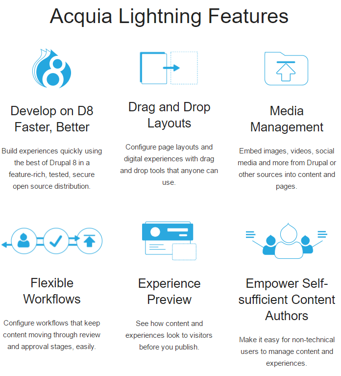Acquia Lightning brings together key modules that together support the four functional areas of layout, media management, content workflow, and experience preview. Members of the Drupal community build and maintain the modules that extend core Drupal functionality. Several Lightning modules were developed under the support of Acquia’s Module Acceleration Program, which coordinates and funds initiatives to accelerate development across the Drupal 8 ecosystem. Lightning is the most installed Drupal 8 distribution, according to Drupal.org.
