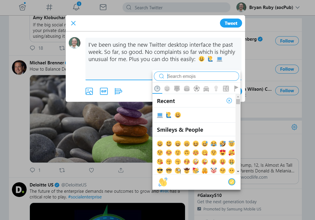 Twitter's New 2019 Web Interface: Composing a new tweet plus emojis