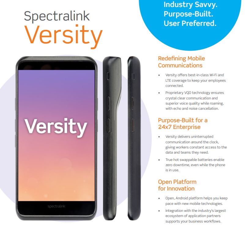 “The Versity mobile solution is optimized for mission-critical healthcare, retail, manufacturing, and hospitality environments,” notes Doug Werking, CEO of Spectralink. “By combining enterprise features with a modern, intuitive user experience Versity helps organizations drive productivity gains by eliminating communication bottlenecks, streamlining workflows and improving customer service.”